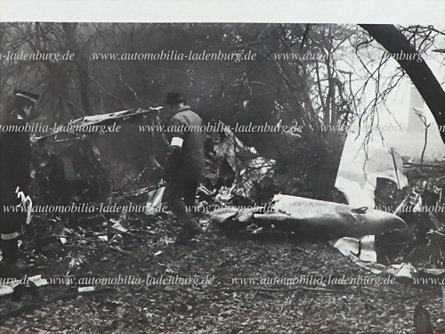 Original s/w Aufnahme / Pressefoto des Unfallwracks des abgestürzten Flugzeugs, bei dem der Rennfahrer Graham Hill sowie fünf weitere Insassen ums Leben kamen, 15x20,5cm