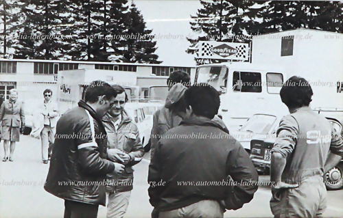 Original s/w Aufnahme Ignazio Giunti im Gespräch mit Arturo Merzario und Team Mitgliedern, 1000KM Nürburgring 1970, 12x18cm
