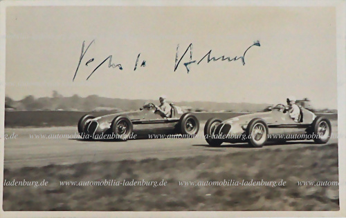 handsignierte original s/w Aufnahme Alberto Ascari auf Maserati 4CLT, signiert von Ascari, 9x14cm