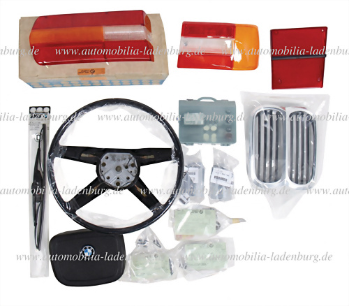 Ersatzteilkonvolut 13tlg., darunter u.a. Lenkrad für u.a. E12/E21 (CAB 1116 887.1), 2x Endrohrblenden E46 (18107500194), Niere 2er Serie (1826675 Gerhardi), Lichtscheibe Rücklicht links E3 2500 (63211355101) im Originalkarton, Universal- Ersatzlampenbox, Lichtscheibe rechts (63211356936) sowie... mehr