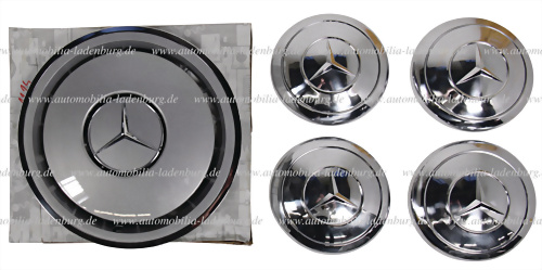 Konvolut 5tlg., darunter 4x Chrom-Radzierkappen 24,5cm Durchmesser, sowie 1x W124 Radkappe (1244010924) in Originalkarton