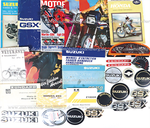 Konvolut 25tlg., darunter u.a. 2x Schriftzüge Suzuki, 4x Embleme, 2x Embleme GSX750, 2x Embleme GSX1100, Jeco Japan Istrumentenanzeige, 1977 Handbuch GS750, 2x Zündapp Schriftzüge, 1x Zündapp Emblem, 1975 Ersatzteilkatalog Typen 434 etc..., restliche Artikel entnehmen Sie unseren Bildern