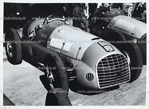 1949/1950, original s/w Aufnahme Benedicto Campos auf Ferrari 166FL (#011F), Siegerauto Fangios während Monza 1949, Rückseite mit Beschreibung, 18x24cm