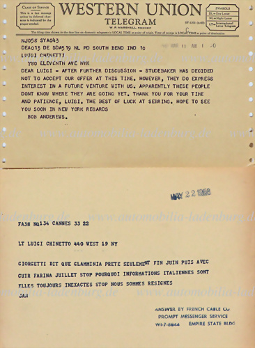 Konvolut 2 Telegrame an Luigi Chinetti, darunter 22.05.1958 bezüglich unzuverlässiger Lieferungen von italienischem Leder, sowie März 1961 bezüglich gescheiterter Verhandlungen mit Studebaker, 2 Seiten franz. u. eng. Text