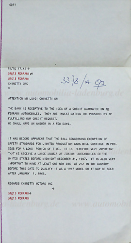 1967, internes Schreiben Chinetti Motors Inc. an Luigi Chinetti Senior bezüglich möglicher Kreditgarantien auf 50 Ferraris, Verzögerungen beim Gesetzesentwurf zur Befreiung von Sicherheitsstandards für Kleinserienfahrzeuge und dahergehend zwingend notwendigem Import hoher Stückzahl vor 31.12.1967... mehr