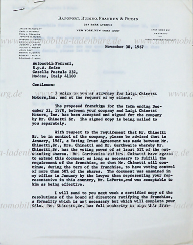 30.11.1967, Anwaltsschreiben für Luigi Chinetti Motors Inc. an Ferrari, betreffend abgeschlossenem Händlervertrag zwischen Ferrari und Chinetti mit Laufzeit bis 31.12.1970, sowie die garantierte Stimmrechtskontrolle Chinetti´s als Bedingung des Händlervertrags, ausgestellt von Chinetti´s Anwalt Paul... mehr