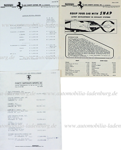 Konvolut 3tlg., darunter: 1976 internes Händlerverzeichnis „Chinetti – Garthwaite Imports INC." 3 Seiten; Einblattprospekt / Preisliste „Luigi Chinetti Motors Inc.“, SNAP Abgasanlagen für Ferrari, sowie Einzelhandelspreise Luigi Chinetti für Lancia Modelle wie GT 2+2, Flaminia 2.8, Flavia 1.8... mehr