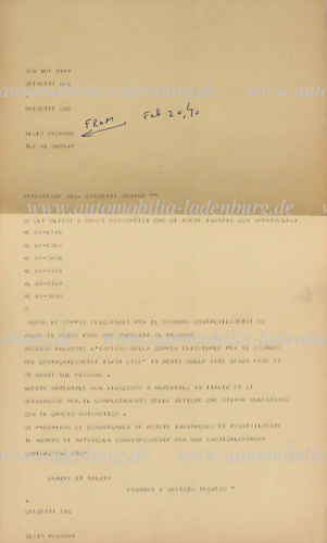 Schreiben des Technischen Büros Ferrari an Chinetti Motors Inc., Ferrari bittet in diesem Schreiben um Unterstützung bei der Teilebeschaffung für den Umbau von 6 Automatikgetrieben (KL 69-1375...), die Chinetti zuvor an Ferrari gesendet hatte, da diese Zusatzteile nicht in Italien zu finden seien, 1... mehr