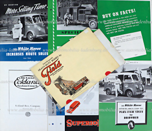 Konvolut 8 Verkaufsprospekte Busse & LKW amerikanischer Hersteller 30er / 40er Jahre, darunter Verkaufsprospekte The White Horse for the Laundry and Dry Cleaner; White 161 Four Cylinder Truck Chassis; Faltprospekt White Trucks 1938; Faltprospekt White 1941; Superior Schulbus; Chevrolet Chassis in School Bus; Verkaufsprospekt Field; Faltprospekt Eckland De Luxe Sedan Coach, engl. Text
