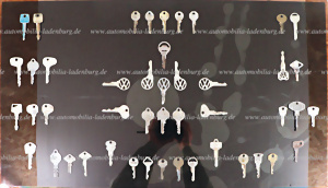 Display mit ingesamt 46 Zündschlüssel 50er - 60er Jahre, darunter zahlreich Schlüssel für Volkswagen; Ford Taunus, Ford Mustang, SEAT, Chrysler, Hudson, GM, Falcon, Lloyd, Audi