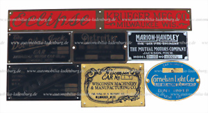 Konvolut 7 Typenschilder USA, u.a. "Wischonsin Machinery & Manufacturing Co."; "American Voiturette Co. Car Nation"; "Marion-Handley"; "Dowagiac Motor Car Co."; "Detroiter The Briggs-Detroiter Co."; "Cornelian Light Car", sowie Eclipse - Krueger MFG.Co"