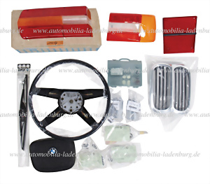Ersatzteilkonvolut 13tlg., darunter u.a. Lenkrad für u.a. E12/E21 (CAB 1116 887.1), 2x Endrohrblenden E46 (18107500194), Niere 2er Serie (1826675 Gerhardi), Lichtscheibe Rücklicht links E3 2500 (63211355101) im Originalkarton, Universal- Ersatzlampenbox, Lichtscheibe rechts (63211356936) sowie Zierring, Rosette, Kappe, Unterlage OVP