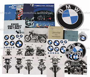 Konvolut 63tlg., darunter u.a.: 9x s/w Werksfotos R50/5 u. R60/S, Ersatzteilliste R25/2 1952, Handbuch R50/50S-R60/69S, über 20 Embleme (aufkleben u. schrauben) für R25/3-R27, R51/2-R68, R50-R69S, 8 Aufnäher, 8 Typenschilder, 9 Emblem-Aufkleber versch. Formate, sowie 7 Prospekte für BMW Motorrad, alles guter Zustand