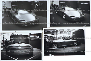 Konvolut 4 original s/w Aufnahmen, Ferrari Mythos auf Messestand, 8,8x12,8cm u. 7,5x11,2cm
