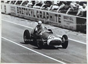 Original s/w Aufnahme (Goddard) Alberto Ascari auf Ferrari 375 F1 während GP. Frankreich 1951, 16x21cm, Rückseite gestempelt
