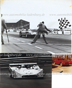 Konvolut 3tlg., darunter 1971 original Farbaufnahme Ferrari 166 MM Touring Berlinetta LM (#0066M) 7x7,5cm, Archivabzug 70/80er Jahre Fangio auf Ferrari D50, Sieger Grand Prix England 1951, 20x25cm, sowie orig. s/w Aufnahme Bell auf Mirage GR7 1970er Jahre, 13x18,5cm, teils mit Verfärbungen u. Verschmutzungen auf Vorderseite