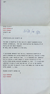 1967, internes Schreiben Chinetti Motors Inc. an Luigi Chinetti Senior bezüglich möglicher Kreditgarantien auf 50 Ferraris, Verzögerungen beim Gesetzesentwurf zur Befreiung von Sicherheitsstandards für Kleinserienfahrzeuge und dahergehend zwingend notwendigem Import hoher Stückzahl vor 31.12.1967 sowie dringender Import des Ferrari 365GT 2+2, um diesen noch als Modelljahr 1967 deklarieren zu können, 1 Seite engl. Text
