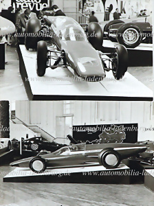 Konvolut zwei original s/w Aufnahmen, Fiat Abarth 2000 Monoposto Rekordwagen auf der Jochen Rindt Show in Wien, 18x24cm
