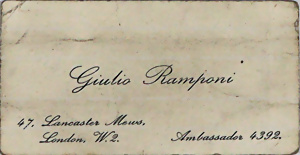 original Visitenkarte, Giulio Ramponi London, Ramponi war Rennfahrer und Mechaniker (Beifahrer), unter anderem Chef Rennmechaniker bei Alfa Romeo, gewann mit Campari die Mille Miglia und arbeitete später auch für die Scuderia Ferrari...selten