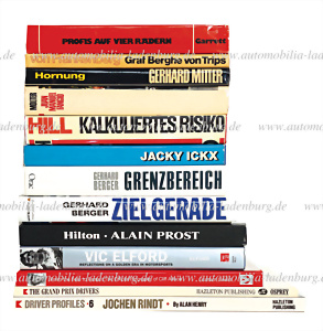 Bücherkonvolut 13 tlg. Fahrerprofile, darunter z.B.: „Juan Manuel Fangio“ von Molter; „Graf Berghe von Trips“ von Frankenberg; „Jochen Rindt“ von Alan Henry; de./ en. Text etc. weitere Titel entnehmen Sie bitte unserem Katalogbild