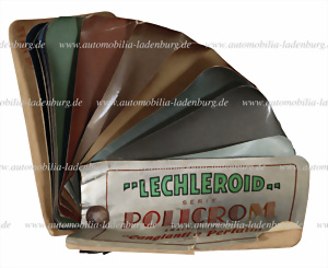 1957, Lechleroid Lackmusterkarte Serie Policrom „Cangianti e Perlati“ mit insgesamt 20 Lackmustern für Ferrari, Fiat, Maserati Fahrzeuge darunter auch seltene zweifarbige Lackierungen wie Verde Periato (Sottosmalto Verde-Smalto Argento), Bleu Periato (Sottosmalto Bleu-Smalto Argento), Amaranto Periato (Sottosmalto Amaranto-Smalto Argento), Lackmuster mit Ferrari Farbbezeichnungen wie Rosso, Azzurro, Celeste, Verde, Dore, Grigio,