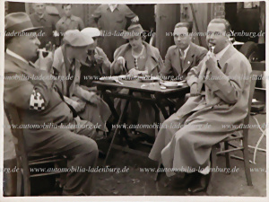 original s/w Aufnahme, Rudolf und Alice Caracciola mit Hermann Lang und Manfred von Brauchitsch bei einer Trainingspause, wohl Nürburgring 1936, 9x12cm