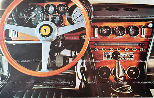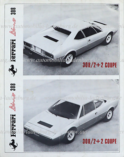 Einblattprospekt Ferrari Dino 308 2+2 Coupe, Rückseite mit technischen Daten, englischer Text, kleiner Einriss am oberen Rand, mittig mit Faltknick