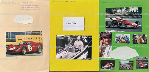 Konvolut 3 handsignierte Belege darunter Paul Frere, Clay Regazzoni, sowie Nino Vaccarella, dazu 9 Aufnahmen (Abzüge neueren Datums)