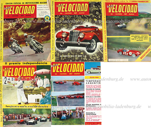 Konvolut 5 Sonderausgaben der Zeitschrift „Velocidad“, mit zahlreichen Berichten zur Carrera Panamericana, sowie verschiedene Grand Prix Rennen, Ausgaben 25.März.1954, 25.Oktober.1954, Rückseite mit Ergebnis Panamericana 1953; Heft 7 25.Dezember.1954, innen mit Ergebnisliste Panamericana 1954; Heft... mehr