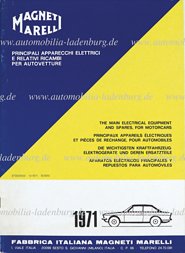 1971, Verkaufskatalog Ersatzteile Magneti Marelli Zündverteiler, für Hersteller wie Ferrari 250LM, 275GTS/GTB, 330GTC, 365GTB/4 Daytona, Dino 246GT...; Abarth 595, 850TC, Alfa Romeo Giulia, 2600 Berlina, Lamborghini Espada GT, 350GT, Miura; Lancia Flaminia, Flavia; Maserati 3500GT; Porsche 911...,... mehr