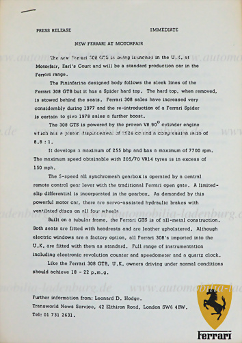 1977, Pressemitteilung zur Einführung des Ferrari 308 GTS auf der Motorfair in London, 2 Seiten englischer Text, mit technischen Angaben zum Fahrzeug