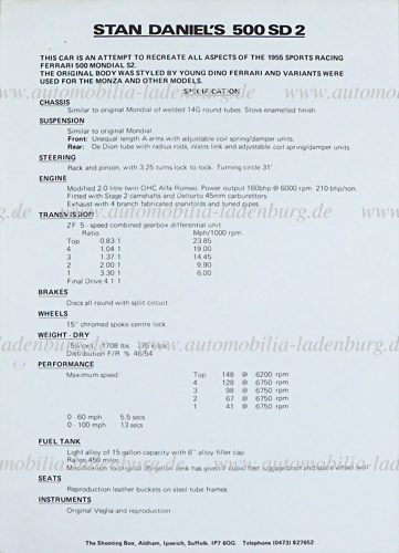 Technisches Datenblatt Stand Daniel´s 500SD 2 (Ferrari 500 Mondial S2 Replica), engl. Text