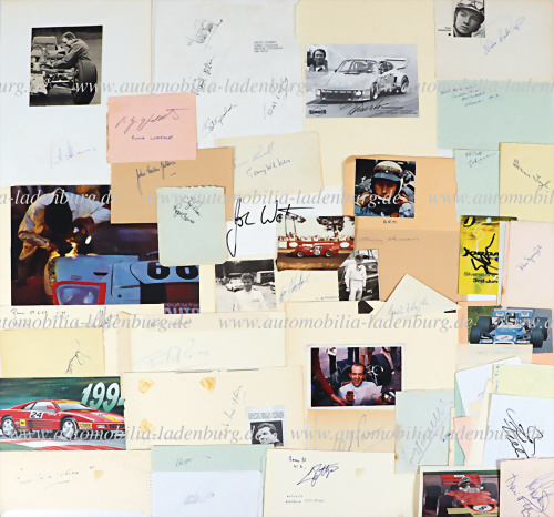 Konvolut 54 handsignaturen überwiegend auf Beleg, darunter z.B. Helmut Marko, Hans Joachim Stuck, Edy Brandenberger, George Abecassis, Graham Hill, Pedro Rodriguez, Alan Rees, Dave Walker, Tim Schenken, Peter Clarke, Raymond Mays, Jochen Mass, Jackie Oliver, Henri Pescarolo, Emerson Fittipaldi,... mehr