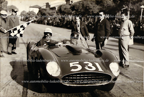 Original s/w Aufnahme de Portage / Nelson auf Ferrari 335S (#0646), Mille Miglia 1957, 9x14cm