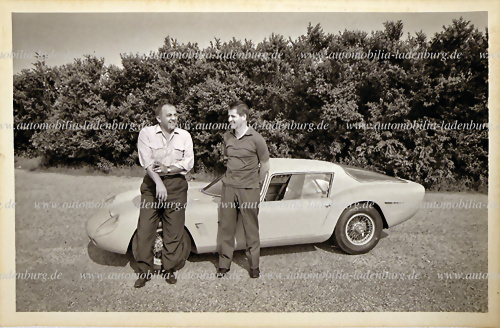 Original s/w Aufnahme Piero Drogo neben Giotto Bizzarini, dahinter der ASA 1000 GTC, 9x14cm