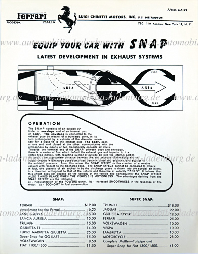 Einblattprospekt / Preisliste „Luigi Chinetti Motors Inc.“, SNAP Abgasanlagen für Ferrari, engl. Text, guter Zustand