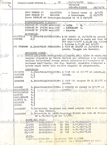 29.12.1976, zeitgenössische Kopie „Communicazione Interna“ betreffend Organisation der Formel 1 Grand Prix in Argentinien und Brasilien 1977. Das Dokument enthält detaillierte Angaben zu eingesetzten Ferrari 312T2 (inkl. Chassis-Zuordnung), Fahrern u.a. Niki Lauda / Carlos Reutemann, Team-Personal,... mehr