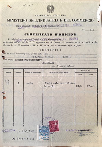 22.1.1957, original „Certificato d’Origine“ für Ferrari Ersatzteile welche von der Scuderia Ferrari an die Garage Francorchamps versendet wurden