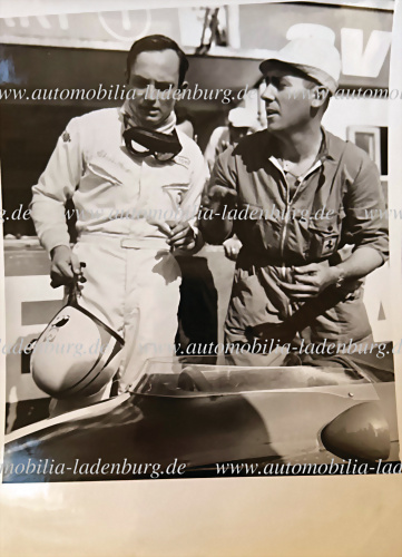 Original s/w Aufnahme Chris Amon mit einem Mechaniker vor seinem Ferrari F1, gestempelt „La Nouvelle Republique“, 24x18cm