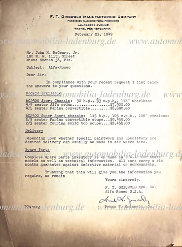 23.2.1949, handsigniertes Angebotsschreiben Alfa Romeo USA an John McGeary, darunter Alfa Romeo 6C 2500 Sport, Alfa Romeo 6C 2500 Super Sport, signiert Griswold Jr.