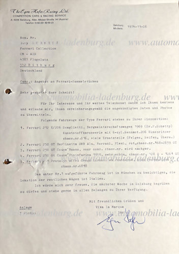 8.11.1974, handsigniertes Angebotsschreiben von Egon Hofer Racing Ltd. an den Sammler Gary D. Schmidt, angeboten werden hier: Ferrari 212E Scaglietti (#0862) (ex. Peter Schetty), Ferrari 250 Swb Competizione (#2839GT), Ferrari 250GT Boano, Ferrari 250GT Coupe PF (#1261GT), Ferrari 330P „Drogo... mehr