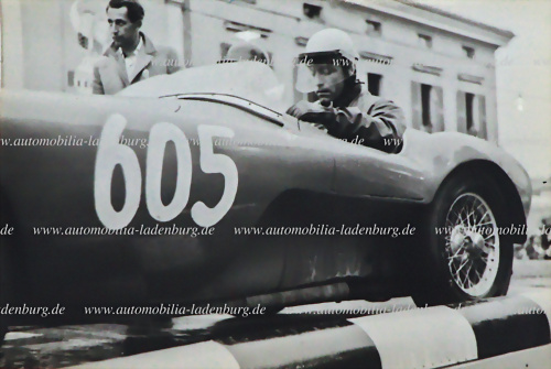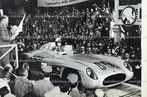 original s/w Aufnahme, Juan Manuel Fangio auf der Startrampe, Mille Miglia 1955, 10x14cm