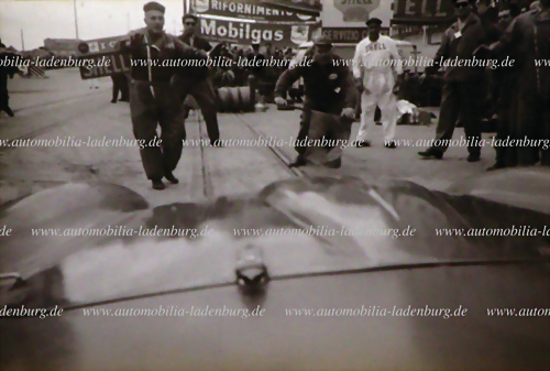 1958, original s/w Aufnahme, Testfahrten Ferrari 412MI in Monza, rechts neben dem Wagen sind Enzo Ferrari und Dragoni zu sehen, 10x14cm