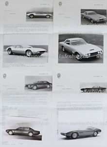 Konvolut 3 Presseinformationen Carrozzeria Ghia, u.a. Ghia Mangusta, Ghia 450SS, Ghia Iso Rivolta S4, sowie Ghia Maserati Ghibli, jeweils mit s/w Werksfoto 13x18cm, engl. Text und original Versandumschlag