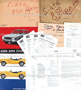 Konvolut darunter Händlerinformation DSI "Deutsche Siata Import Urbach KG", 4 Seiten datiert 01.02.1969; 2x Einblattprospekt Siata 850 Spring; Preisliste Siata 850 Spring, datiert 15.03.1968, sowie Faltprospekt Siata 1600 TS, inkl. Versandumschlag