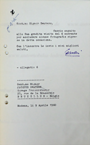 Modena 09.April 1960, handsignierter Brief von Enzo Ferrari an Jacques Swaters, betreffend Zusendung einiger Fotografien vom Besuch am 06.April.1960