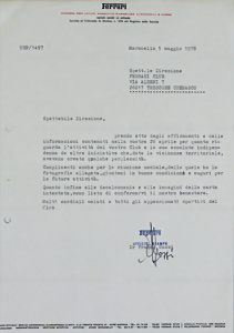 Maranello 05.Mai.1978, handsignierter Brief von Franco Gozzi an den Ferrariclub in Trescore Cremasco betreffend Glückwünsche zur Gesellschaftsversammlung sowie Bestätigung der zugesendeten Fotografie