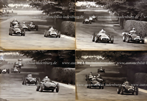 Konvolut 4 original s/w Aufnahmen GP Italien 1957, u.a. Lewis-Evans vor Brooks auf Vanwall VW57; Tony Brooks vor Stirling Moss auf Vanwall VW57, sowie zwei Aufnahmen Fangio auf Maserati 250F im Zweikampf mit Moss auf Vanwall, je 10x14,5cm