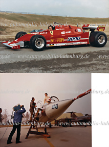 Konvolut 2 original Farbaufnahmen Gilles Villeneuve auf Ferrari 126C, Präsentation in Fiorano 1981, 20x30cm, dazu Farbaufnahme Villeneuve bei Werbeaufnahmen im Cockpit des F-104 Kampfjets, 20x25,5cm