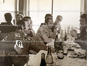 Original s/w Aufnahme Niki Lauda, Clay Regazzoni und Piero Lardi Ferrari beim Mittagessen, ca. 1974, 18x24cm, gestempelt "Keystone"